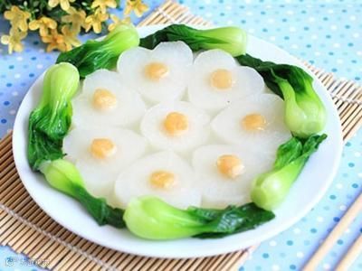吃好吃饱不是高手,吃出“境界”才是战士。这重境界就是中国美食讲究的“养”——营养搭配。“每逢过节胖三斤”,春节过后急于减肥的朋友不妨尝试荤素搭配的家常菜“玲珑玉心”。白萝卜和干贝清淡不失鲜美,边缘的一圈上海青更能补充维生素和矿物质,如此“高配组合”实为大鱼大肉后的解腻之选。