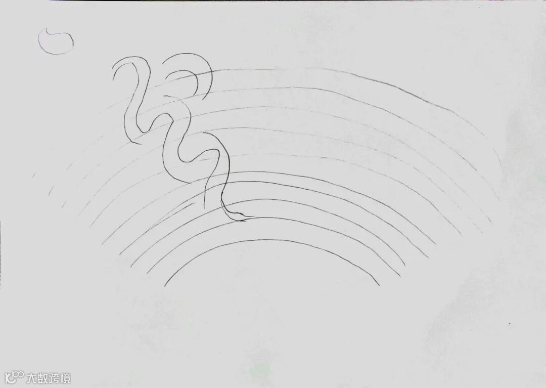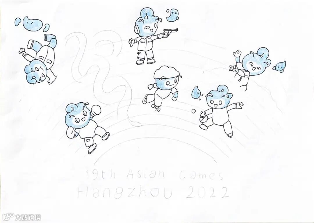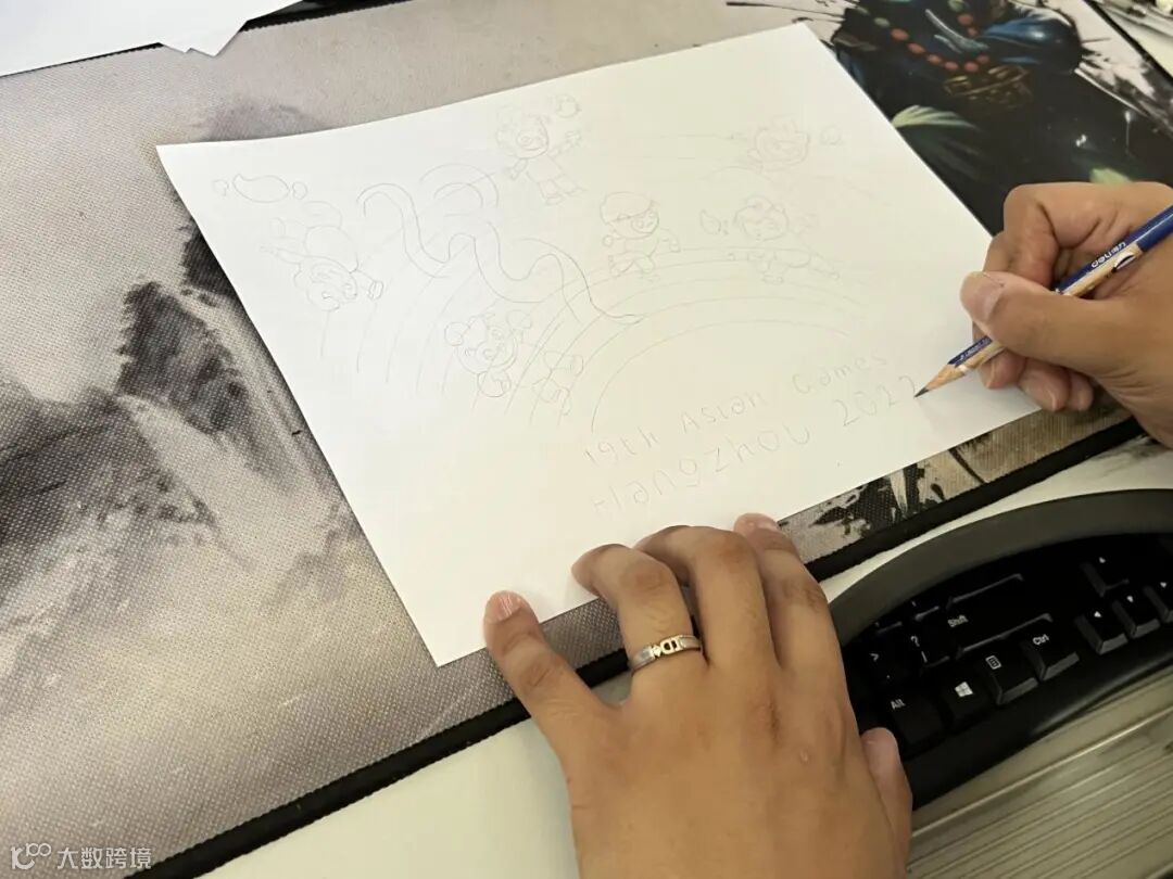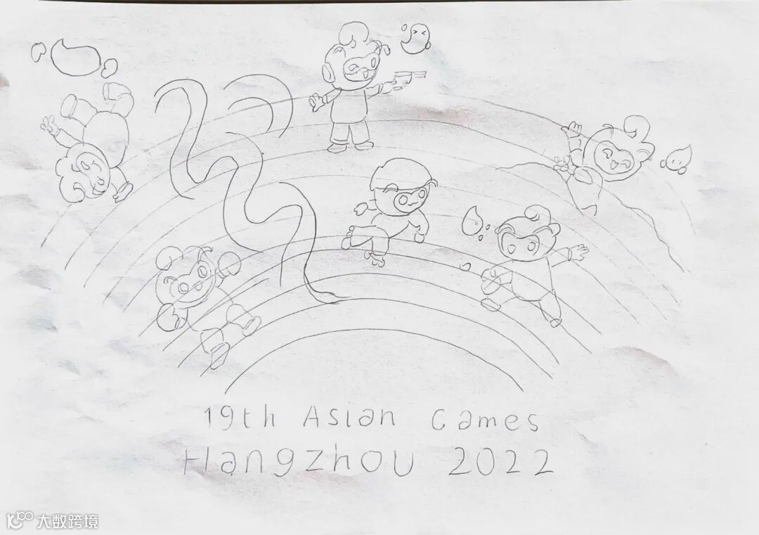 首先用铅笔勾勒出杭州亚运会的标志“潮涌”:扇面、钱塘江、钱江潮头、赛道、互联网符号及象征亚奥理事会的太阳图形。
