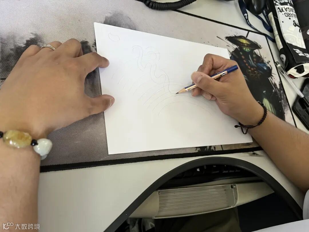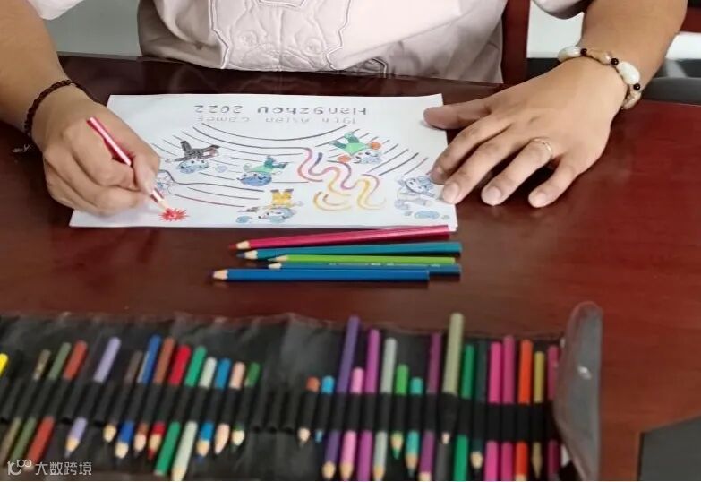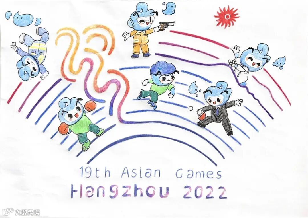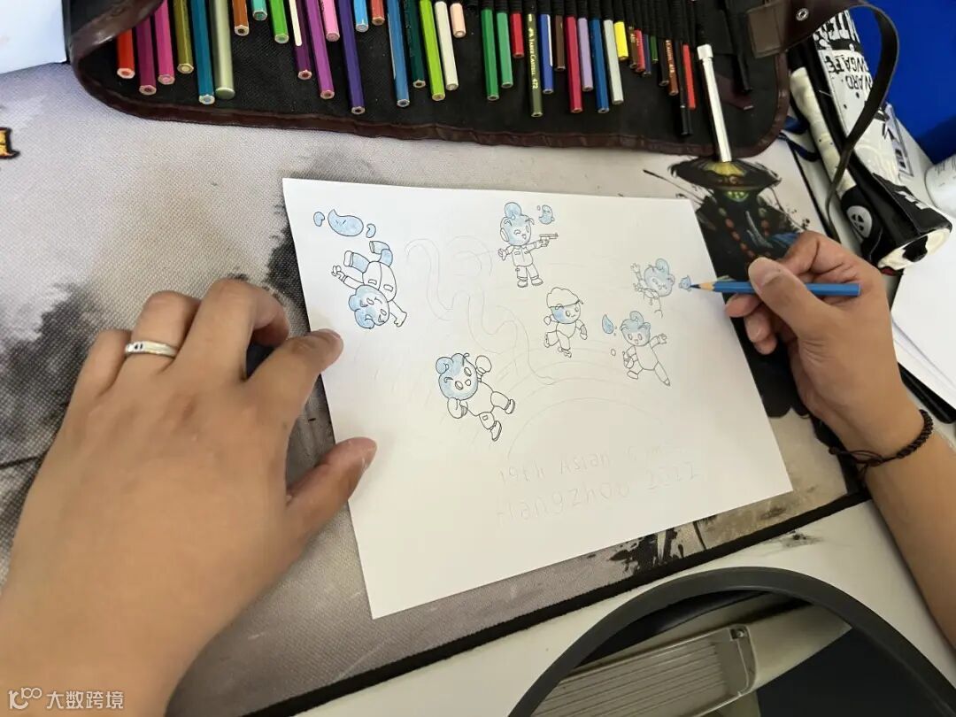 首先用铅笔勾勒出杭州亚运会的标志“潮涌”:扇面、钱塘江、钱江潮头、赛道、互联网符号及象征亚奥理事会的太阳图形。