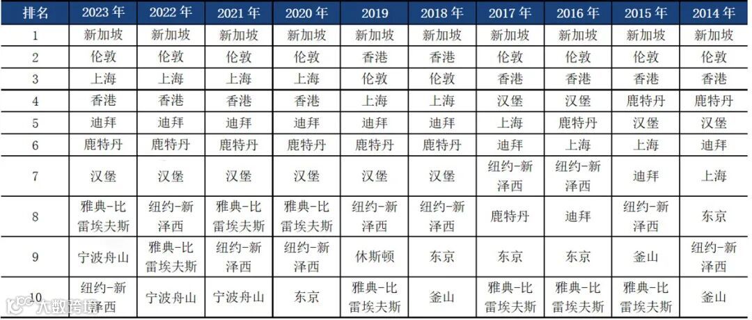 此次发布的《报告》显示,2023年全球航运中心城市综合实力前10位分别为新加坡、伦敦、上海、香港、迪拜、鹿特丹、汉堡、雅典-比雷埃夫斯、宁波舟山、纽约-新泽西。相较去年,前十城市总体保持稳定,雅典-比雷埃夫斯和宁波舟山排名各自攀升一名。