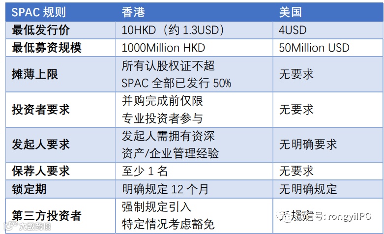 而香港SPAC上市规则独具特色,通过港美SPAC规则对比,不难发现具体操作上联交所设置相对来讲各方面要求更完善,一方面对发起人,合格投资者等方面相对要求更加严格,另一方面,对通过SPAC完成上市的企业基本资质标准更明确: