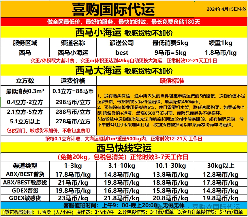 因为税金和清关费用持续上涨,因此对西马大海运渠道运费价格做调整处理,其他渠道运费价格不变。以下是西马大海运新价格:(4月14号当天晚上23点59分前下的订单的按旧价格计费,新价格表于4月15号凌晨开始执行)