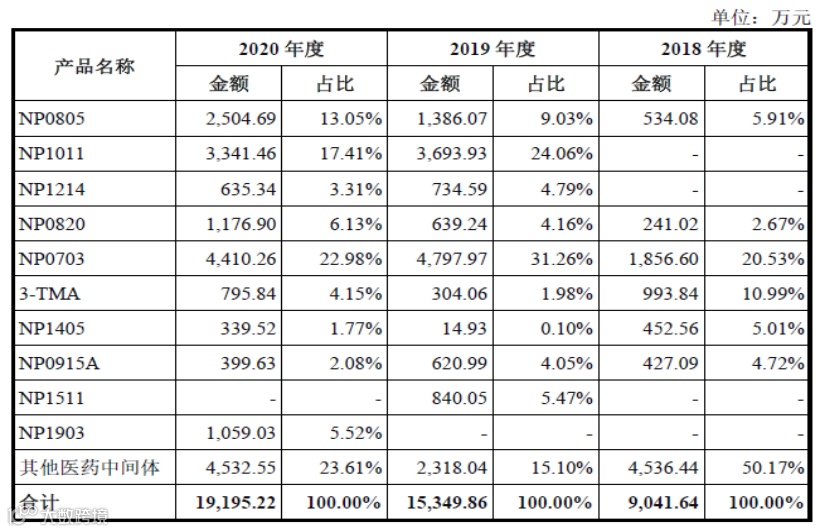 根据招股说明书披露,(1)2020年公司向苏州六元环2,771.42万元、占当年收入的7.43%,对应的产品主要为NP0703;(2)NP0703系报告期内实现销售的第一大医药中间体产品,NP0703是已上市药物,市场需求较为稳定。