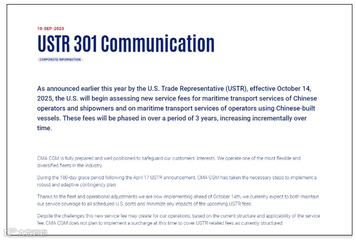 9 月 10 日,达飞集团对外发布最新公告,就美国即将针对中国船舶征收港口费的相关事宜,明确表示已做好全面应对准备。