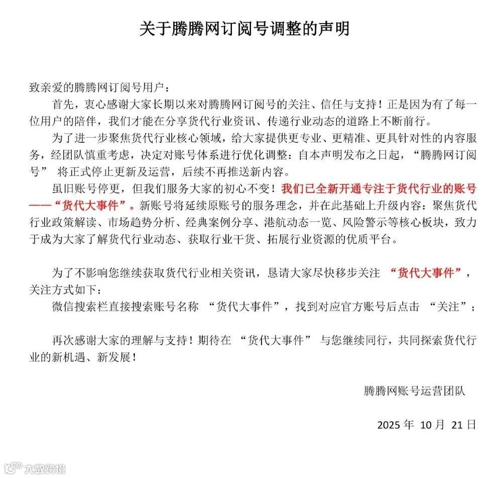 这里是物流与供应链的【头条】发布地——链接全球贸易,赋能货代精英,为您提供最新、最关键的行业大事件解读。政策变动、市场趋势、港航动态、风险警示、实战案例...尽在【货代大事件】。新闻线索|业务合作请联系:news@tengteng.net.