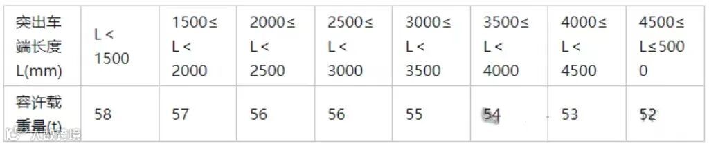 6)超长均重货物使用60t、61t平车装载,两端均衡突出时,货物重量不得超过下表(超长均重货物两端均衡突出时车辆容许装载量表)的规定: