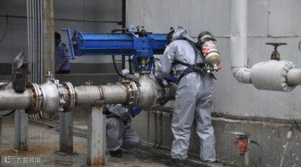 3清洗:确定泄压完成后,打开人孔盖,用新配置的清洗剂溶液大量喷淋,保证没有刺激性蒸汽外泄。之后,逐步喷淋罐箱内壁,以完全消除刺激性蒸汽为准。待刺激性完全消除,使用普通清洗剂或者清水,冲洗干净即可。其中管件阀门拆卸下来后,用清洗剂溶液浸泡至刺激性消失后,用清水清洗干净即可。