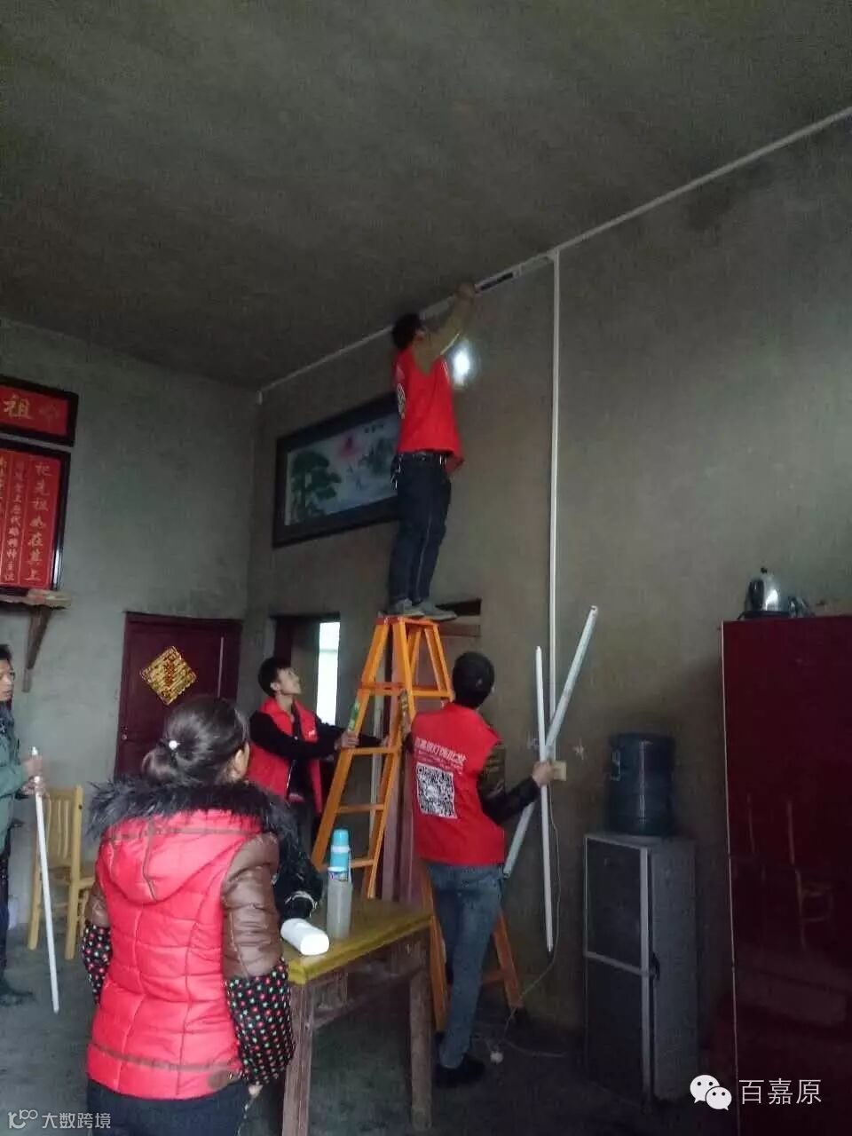 村民的灯具得到了解决,我们也感到了欣慰,看到村民需要帮助,我们的“爱心团队”第一时间跑到车子上拿上梯子迅速前往村民家。