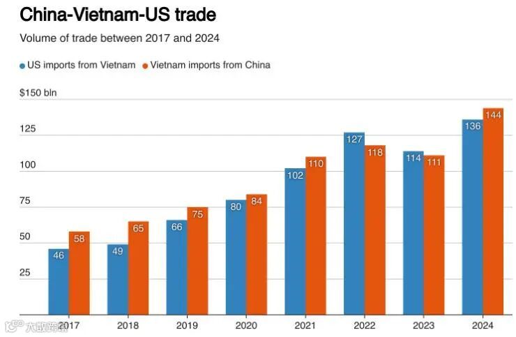 自 2018 年美国开始征收广泛关税以来,越南对美国的出口几乎增加了两倍,推动一些制造商将生产转移到越南。同时,越南从中国的进口也大幅扩大,2024 年,美国和越南的数据显示,双边贸易额各自总计约 1400 亿美元。