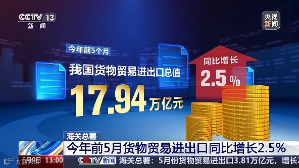 据海关统计,2025年前5个月,我国货物贸易进出口总值17.94万亿元人民币,同比(下同)增长2.5%。其中,出口10.67万亿元,增长7.2%;进口7.27万亿元,下降3.8%。