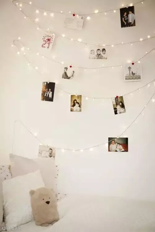7.如果不喜欢用照片框,可以把照片夹在串灯上哦。
