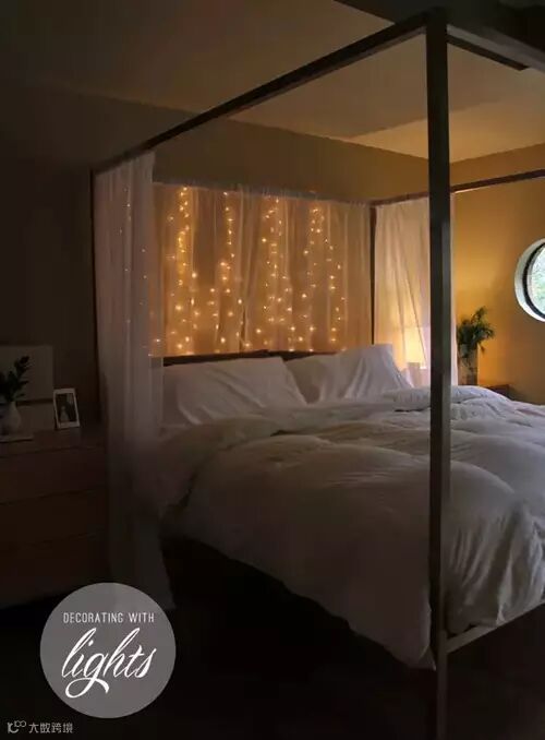 3.你也可以在床架后面挂串灯,简单的情景灯立马呈现。