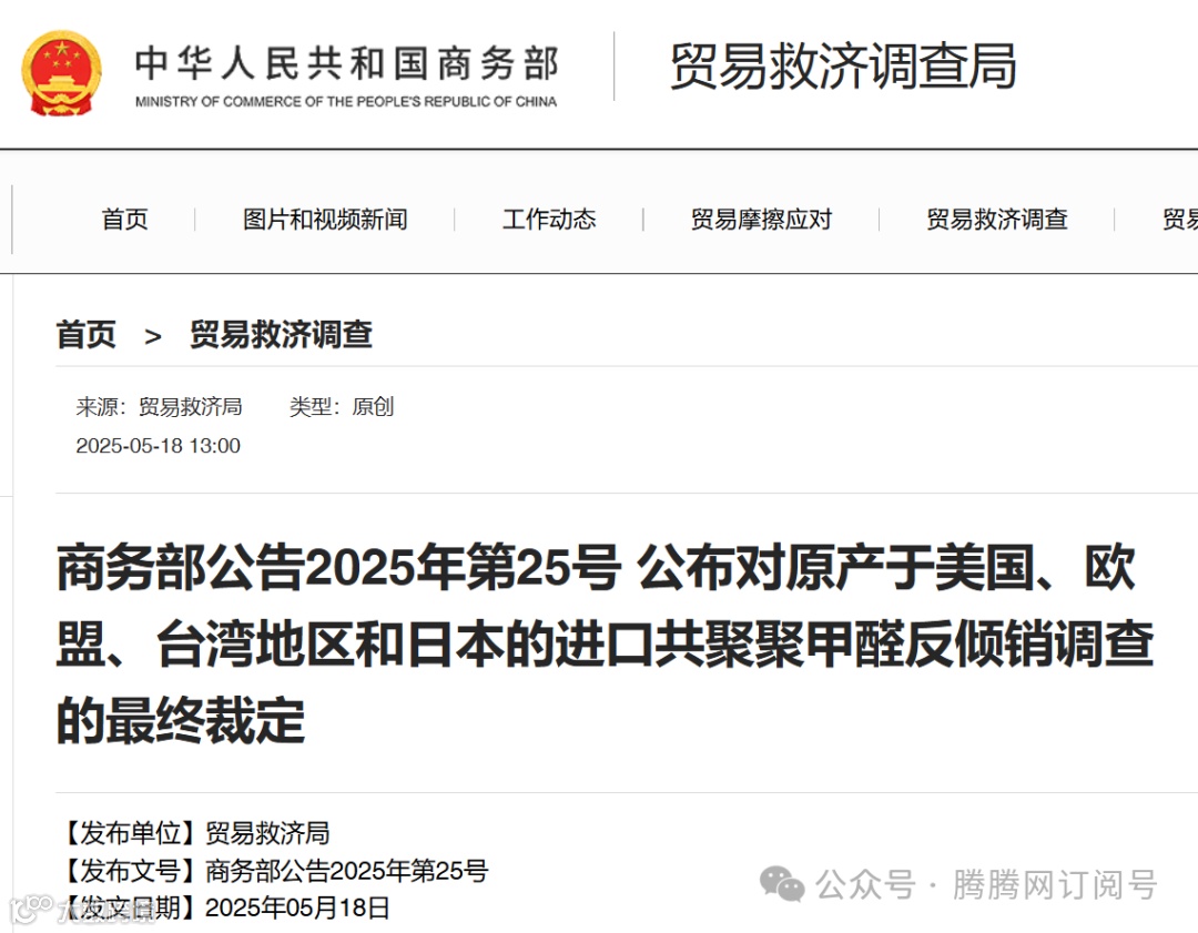 就在特朗普对中国发出威胁之际,中国商务部迅速做出了回应。5 月 18 日,商务部发布公告,决定对原产于美国、欧盟、日本和台湾地区的进口共聚聚甲醛征收反倾销税,其中美国企业的税率高达 74.9%。