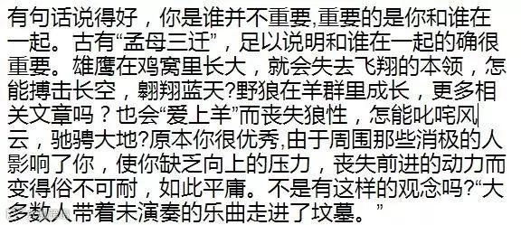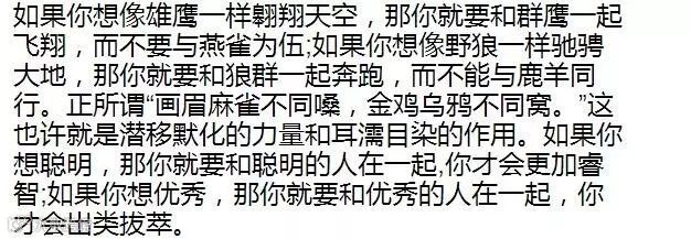 在现实生活中,你和谁在一起的确很重要,甚至能改变你生活的轨迹,决定你的人生成败。和什么样的人在一起,就会有什么样的人生。和勤奋的人在一起,你不会懒惰;和积极的人在一起,你不会消沉;与智者同行,你会不同凡响;与高人为伍,你能登上巅峰。
