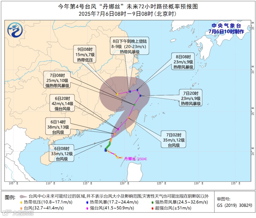 大风预报:7月6日14时至7日14时,南海东部和南部的部分海域、台湾海峡、台湾以东洋面、巴士海峡、东海西南部及钓鱼岛附近海域、广东东部沿海、福建沿海、浙江沿海、台湾岛沿海将有6-8级大风,阵风9~10级,其中南海东北部、东海西南部的部分海域、台湾海峡、台湾以东洋面、巴士海峡西部、台湾岛沿海的风力有9-11级,阵风12-13级,“丹娜丝”中心经过的附近海域或地区风力有12-14级、阵风15级。