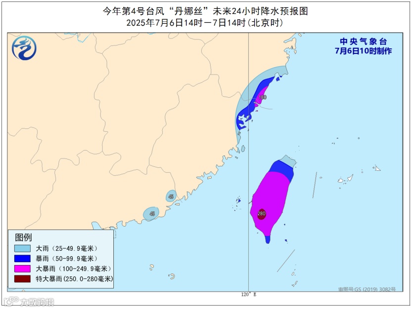 降水预报:7月6日14时至7日14时,广东东部、福建东北部、浙江东南部、台湾岛等地部分地区有大到暴雨,其中,浙江南部沿海、台湾岛中南部等地部分地区有大暴雨,台湾岛南部局地特大暴雨(250-280毫米)。