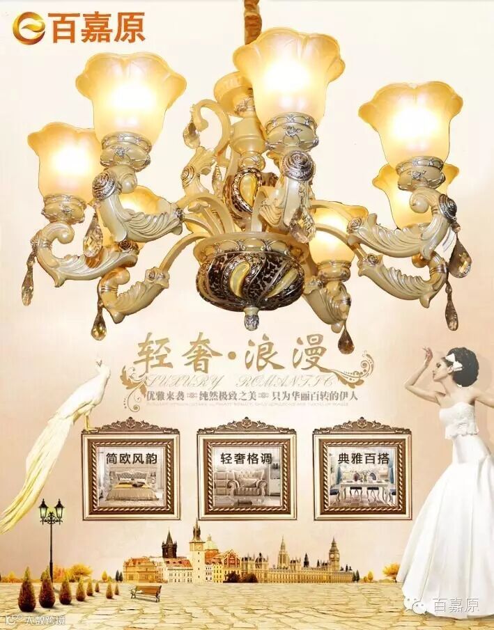欧式仿玉吊灯富丽堂皇,比较有层次感,富有理性主义。主要出现在比较华丽、高贵的场所。