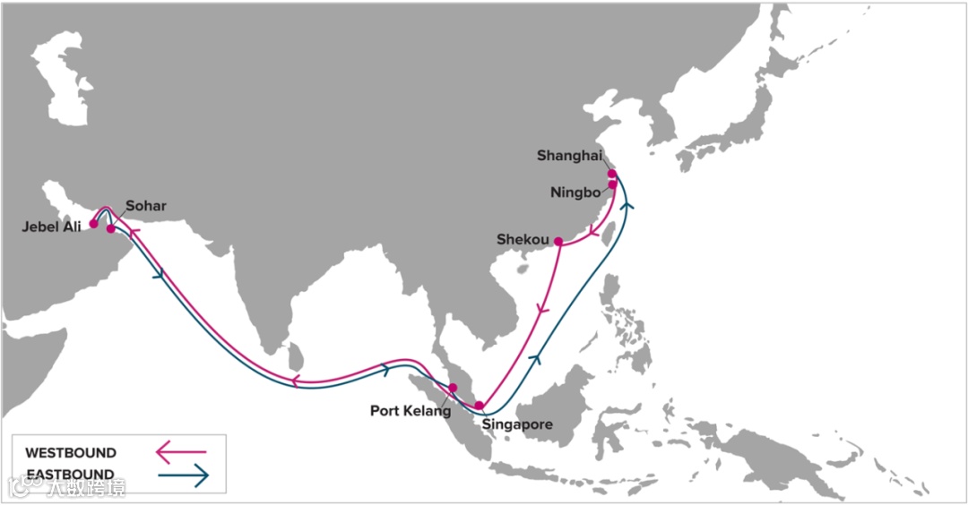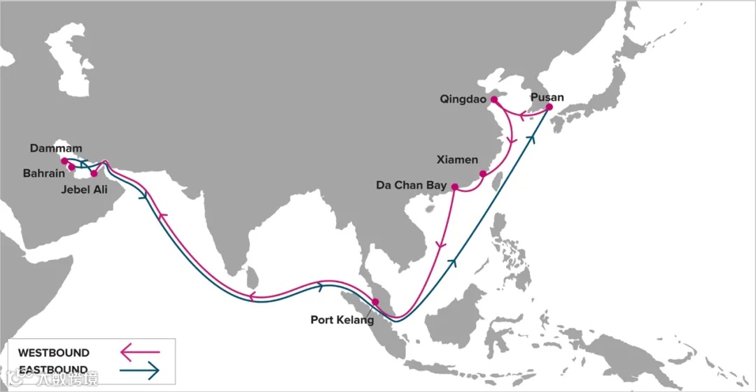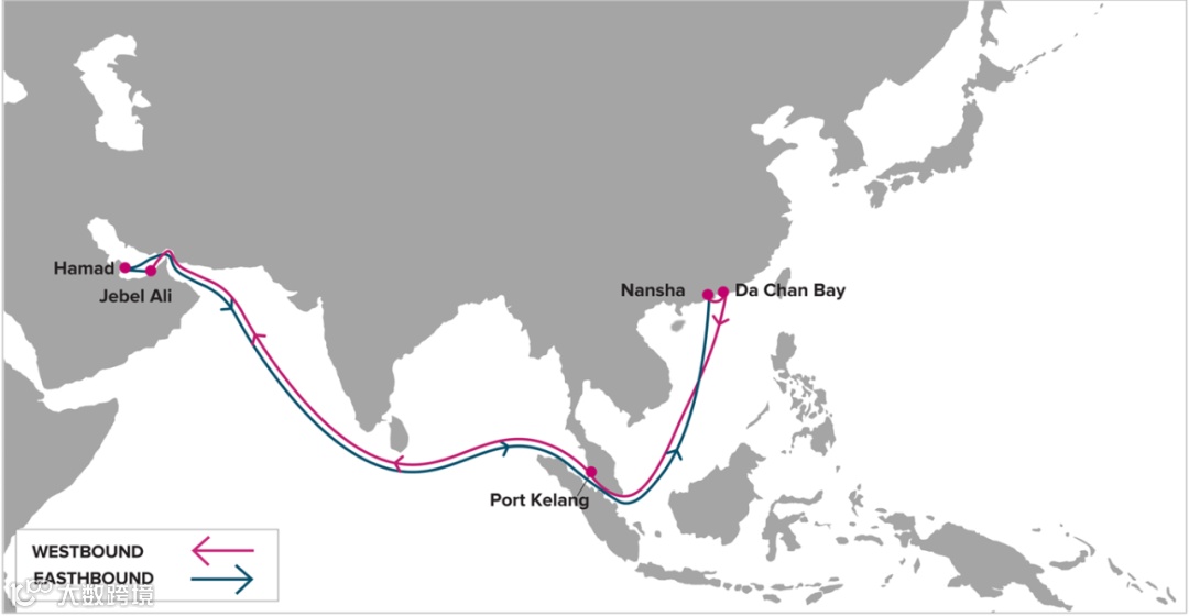 南沙出发,挂靠港序为:南沙–大铲湾–巴生港 –杰贝阿里–哈马德港–南沙。