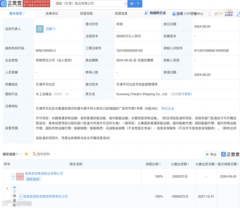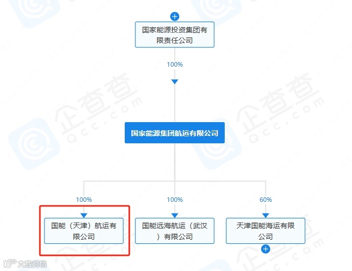 企查查股权穿透显示,该公司由国家能源集团航运有限公司全资持股,后者为国家能源投资集团有限责任公司全资子公司。