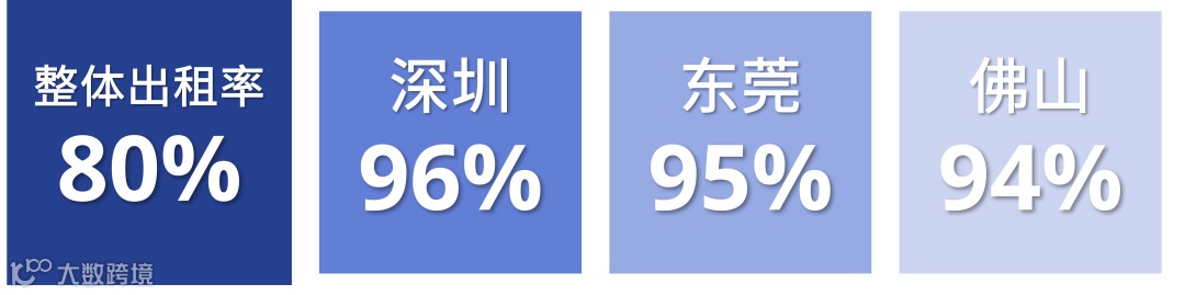 市场整体出租率在80%,较上一个半年环比提升2个百分点(pp)。17个城市的出租率在80%以上;8个城市在90%以上,其中5个位于华南。