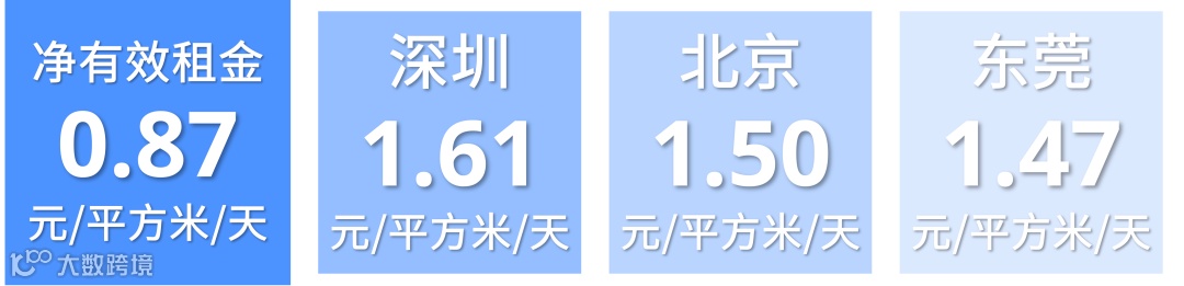 市场平均租金为人民币0.87元/平方米/天。共有7个城市租金高于1元/平方米/天,租金高地主要集中在大湾区、京津冀和长三角三大城市群的一线城市及其周边卫星城。深圳、北京、东莞的净有效租金位列前三。