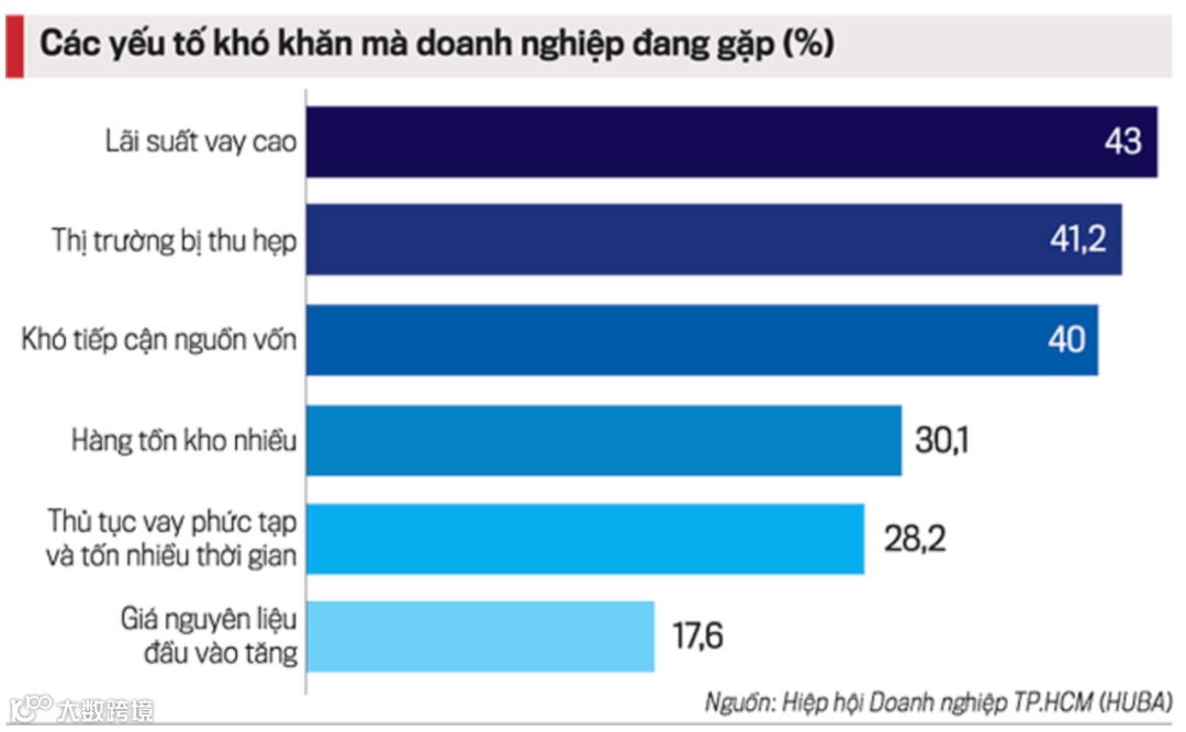 据TP企业协会统计,越南企业遇到的主要困难有高利率贷款(43%)等,如下图: