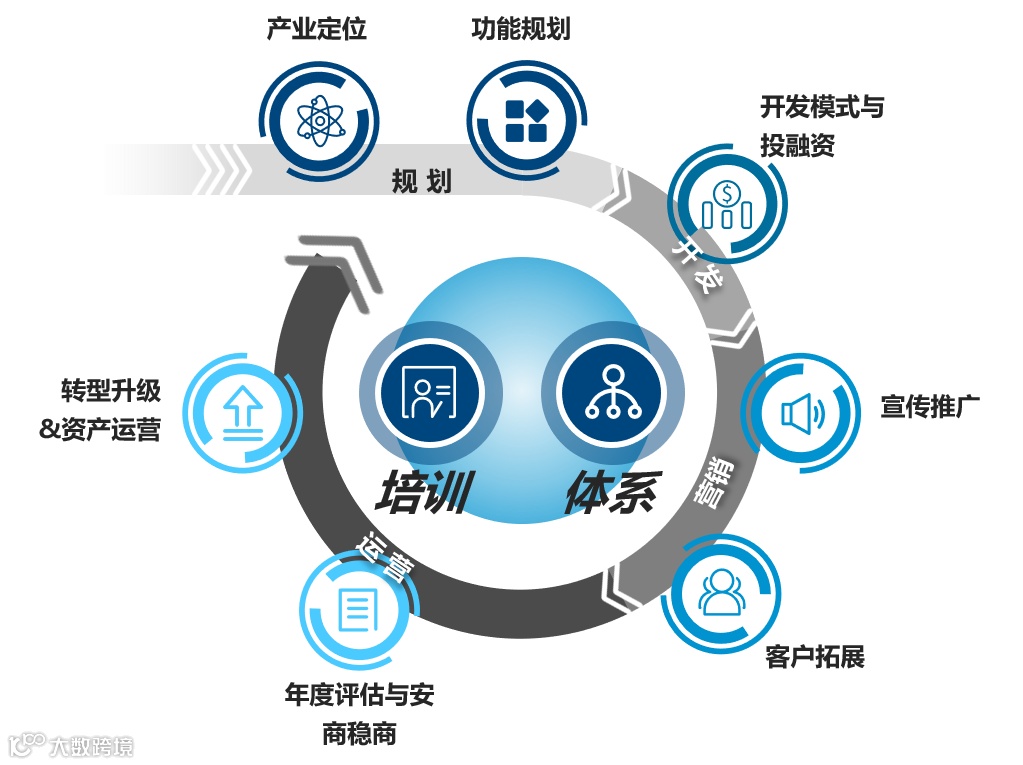 产业定位、功能规划、开发模式与投融资、宣传推广、客户拓展、年度评估与安商稳商、转型升级和资产运营