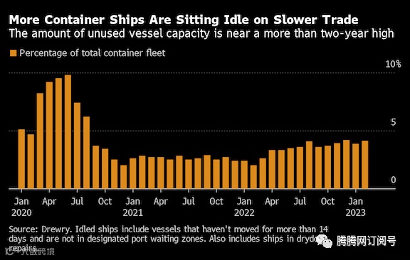 根据英国航运咨询机构德路里(Drewry)的数据显示,今年2月份,全球约4.1%的集装箱船队处于闲置状态,相当于106.7万TEU运力闲置——这一数字几乎是去年同期的两倍,接近于去年12月的107万TEU,闲置运力创下2020年8月以来最高水平。