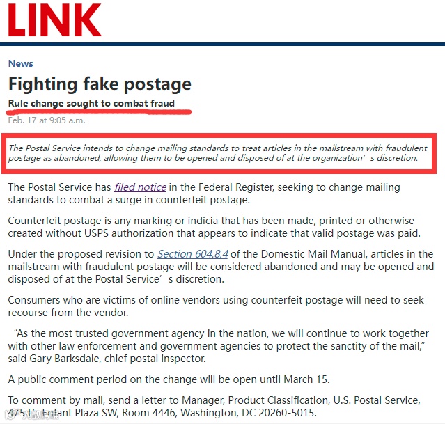 针对美国邮政此次的DMM修订,美国民众在2023年2月15日到3月15日期间都可以提出相应意见。