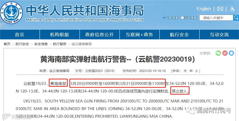 云航警19/23,黄海南部,3月20日0900时至1600时和3月21日0900时至1100时在34-52.0N 120-00.0E、34-52.0N 120-13.0E、34-44.0N 120-13.0E和34-44.0N 120-00.0E四点连线范围内进行实弹射击,禁止驶入。