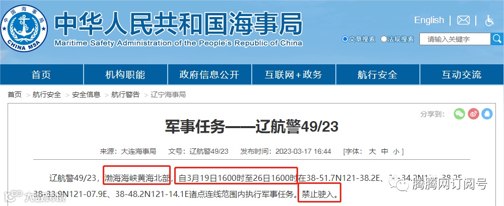 据中国海事局网站消息:近日,渤海海峡、黄海北部、黄海南部、南海等海域因执行军事任务--实施禁航。可能会对部分港口船舶造成一定影响,船舶晚开晚靠、船期延误等,货主货代做好预期准备。