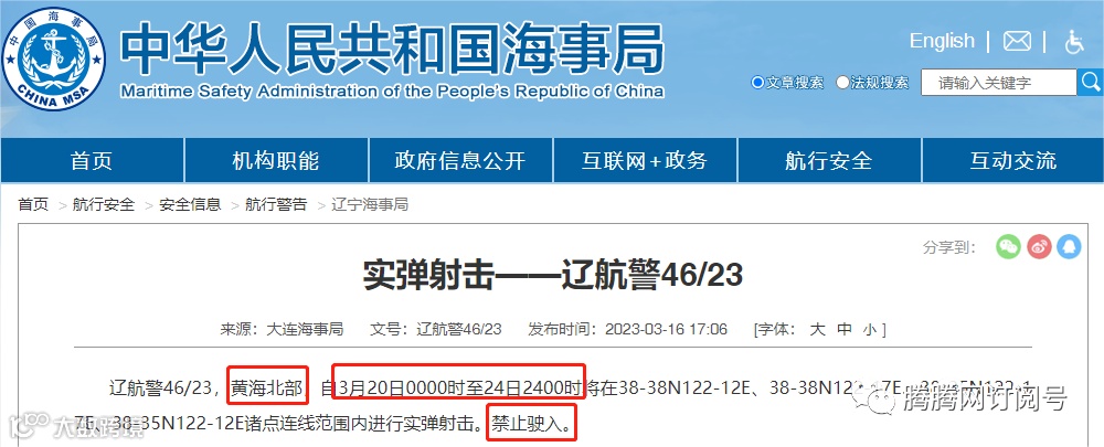 辽航警46/23,黄海北部,自3月20日0000时至24日2400时将在38-38N122-12E、38-38N122-17E、38-35N122-17E、38-35N122-12E诸点连线范围内进行实弹射击。禁止驶入。