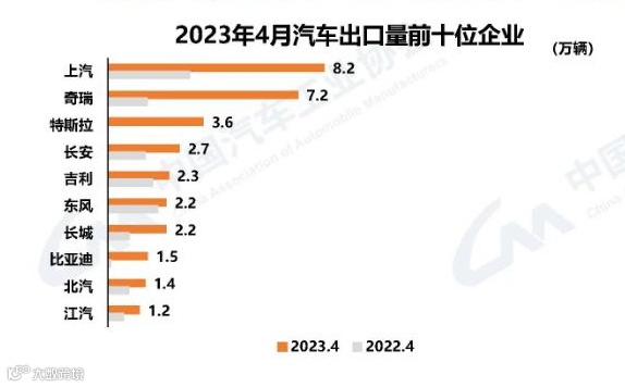 4月,在整车出口的前十位企业中,上汽出口量达8.2万辆,同比增长1.6倍,占总出口量的21.7%。与上年同期相比,