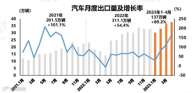 4月,汽车企业出口37.6万辆,环比增长3.3%,同比增长1.7倍。