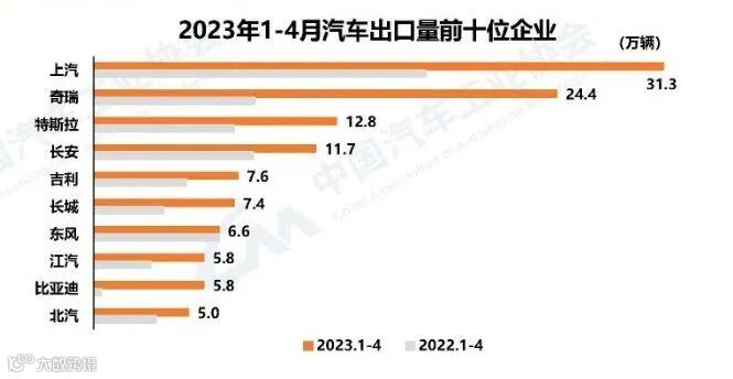 1-4月,整车出口前十企业中,从增速上来看,比亚迪出口5.8万辆,同比增长13.4倍;奇瑞出口24.4万辆,同比增长1.9倍: 长城出口7.4万辆,同比增长99.1%。