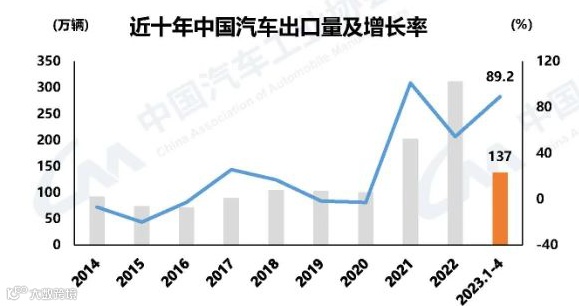 1-4月,汽车企业出口137万辆,同比增长89.2%。