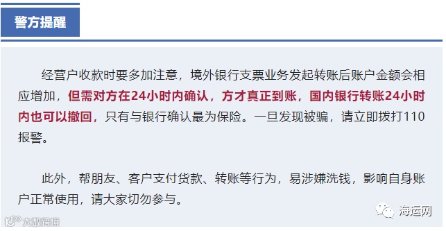 经过了解,倪先生才得知,原来这名客户实际是使用境外银行支票业务发起转账,如果24小时内不与银行确认,转账资金就会撤回。倪先生因此被骗人民币10万元。义乌市公安局商城派出所已对该案立案侦查。