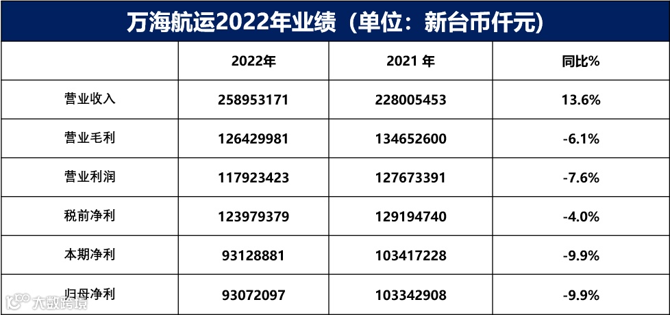 万海航运2022年全年累计实现营业收入新台币2589.53亿元(约86.88亿美元),同比增长13.6%;毛利达到新台币1264.30亿元,同比下降6.1%;净利润达到新台币930.72亿元(约31.22亿美元),同比下降9.9%。