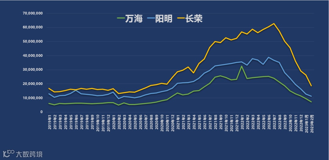 2023年2月,长荣海运2023年2月营业收入达到新台币186.80亿元(约6.05亿美元),同比下降66.22%,环比下降28.81%,下跌