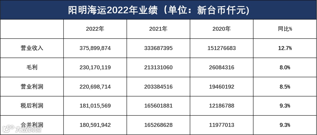 阳明海运2022年全年累计实现营业收入新台币3759.27亿元(约126.12亿美元),同比增长12.7%;毛利达到新台币2301.70亿元,同比增长8.0%;净利润达到新台币1805.91亿元(约60.59亿美元)或每股净利新台币51.71元,同比增长9.3%。