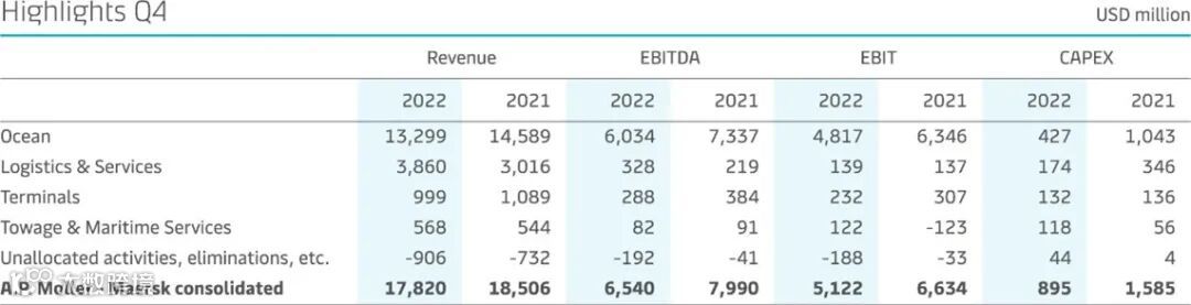基于这些假设,A.P. 穆勒-马士基预计2023年全年实际息税折旧及摊销前利润 (EBITDA)为80-110亿美元,实际息税前利润( EBIT) 为20-50亿美元,自由现金流(FCF) 至少为20亿美元。2022-2023年,预计资本支出维持90-100亿美元。2023-2024年,针对公司综合物流战略、技术和脱碳的投资,预计累计资本支出为100-110亿美元。在不影响财务预期的情况下,考虑公司品牌重组和整合,预计第一季度将产生4.5亿美元的减值和重组费用。