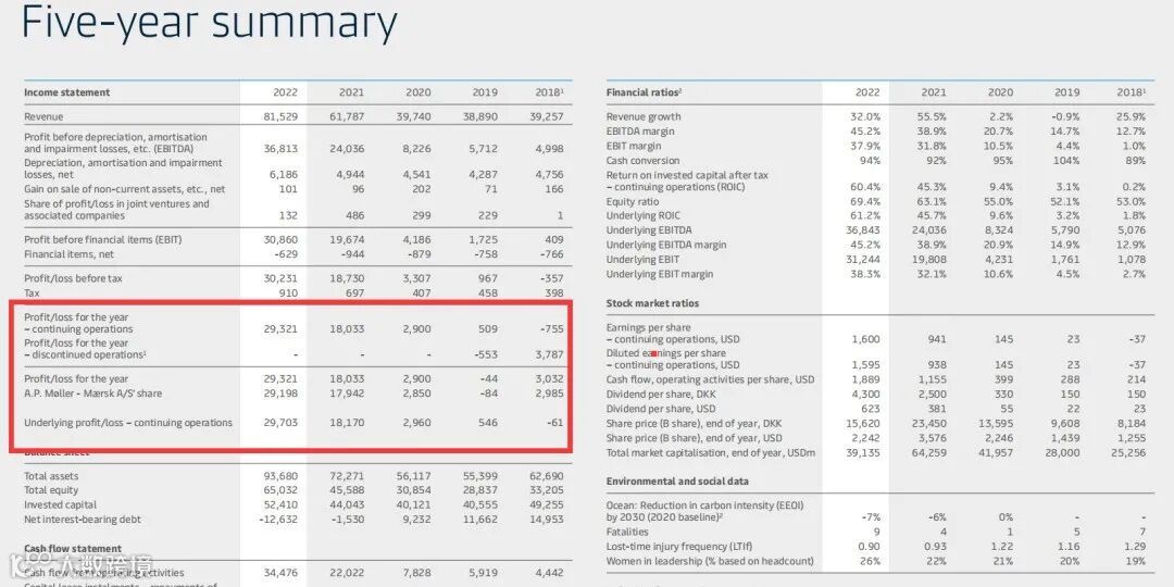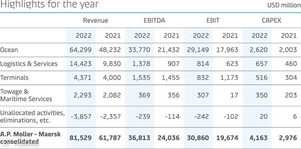 2022年,A.P.穆勒-马士基(马士基)实现与全年预期相符的非凡业绩表现:营收增长32%至815亿美元,息税前利润(EBIT)增长57%至309亿美元。净利润293亿美元。