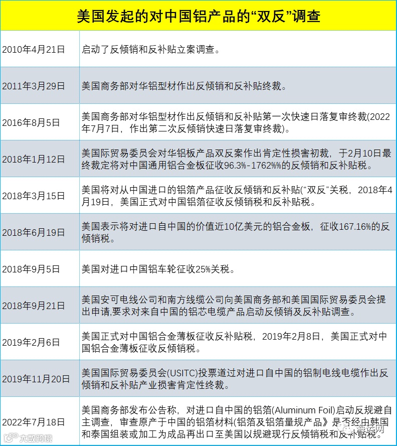 美国的贸易保护措施对中美铝产品贸易产生了一定影响。中国铝挤压材、铝箔、铝板带等产品在美国发起双反调查后,出口均出现下滑。