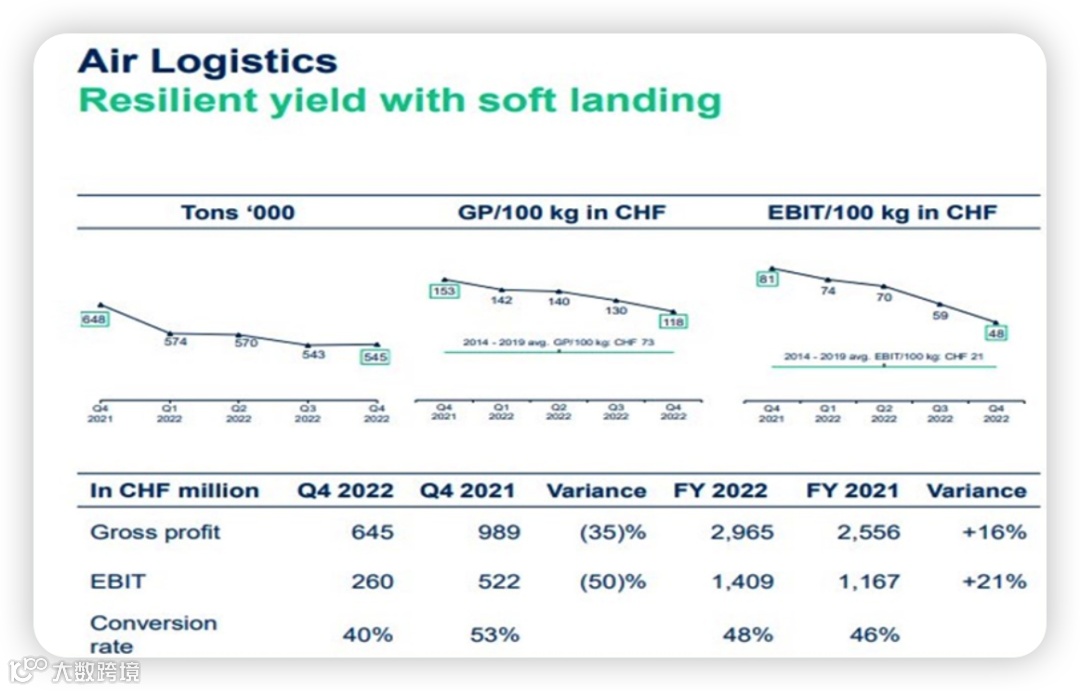 仅就四季度而言,航空物流业务实现净营收25.98亿瑞士法郎,同比下降39%;毛利达到6.45亿瑞士法郎,同比下降35%;息税前利润为2.60亿瑞士法郎,同比下降50%。