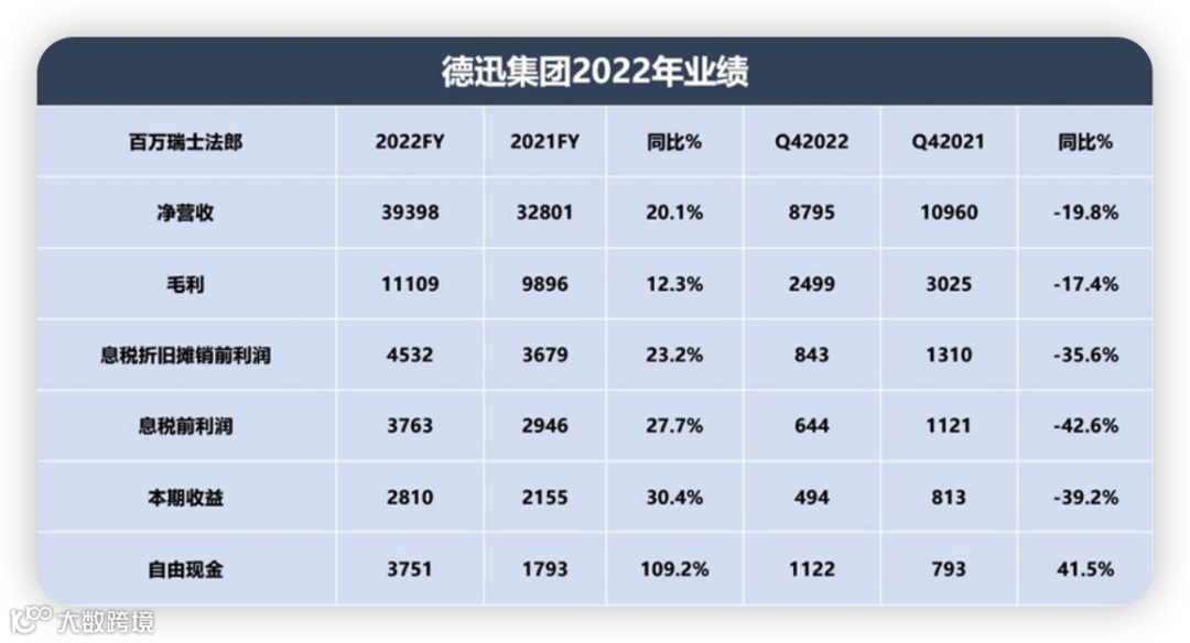 财报披露,2022年全年,德迅集团取得创纪录的业绩。全年净营收同比增长20.1%达到393.98亿瑞士法郎(约合420亿美元);毛利同比增长12.3%至111.09亿瑞士法郎;息税折旧摊销前利润(EBITDA)达到45.32亿瑞士法郎,同比增长23.2%;息税前利润(EBIT)同比上升27.7%至37.63亿瑞士法郎(约合40亿美元)。