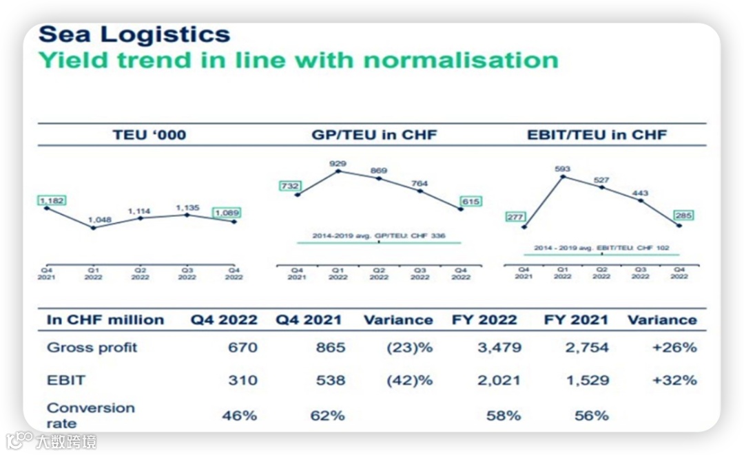 仅就四季度而言,海运物流板块实现净营收39.14亿瑞士法郎,同比下降14%;毛利达到6.70亿瑞士法郎,同比下降23%;息税前利润为3.10亿瑞士法郎,同比下降42%。
