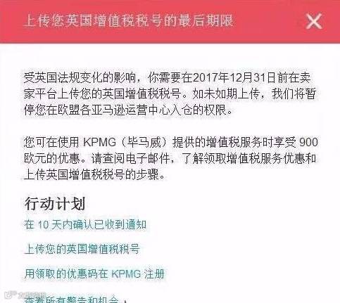 在过去的两天里,许多英国站的卖家收到了VAT最后期限的通知:“如果未在2017年12月31日前在上传VAT税号,卖家将被暂停在欧洲亚马逊运营中心入仓的权限。仍未注册税号的卖家尽快注册。
