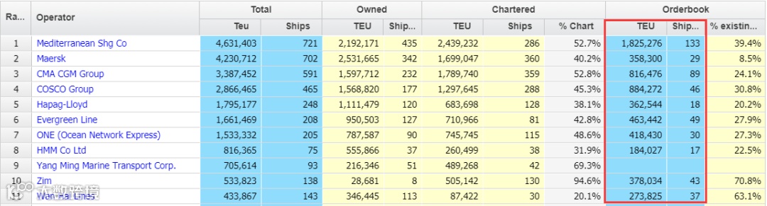 目前,长荣在建船舶49艘,总运力463442TEU,但做为航运市场领导者的MSC拥有最大的在建船舶订单量,在建船舶133艘,总运力超过180万TEU,紧随其后的是中远海运(884272TEU)和达飞轮船(816476TEU,