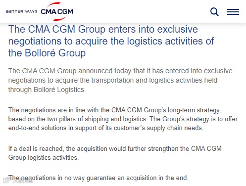 早在2月份,就有传言称达飞对Bolloré Logistics感兴趣。据彭博社报道,达飞首席执行官萨德(Saadé)很长一段时间以来一直将Bolloré的物流业务视为明确的收购目标。