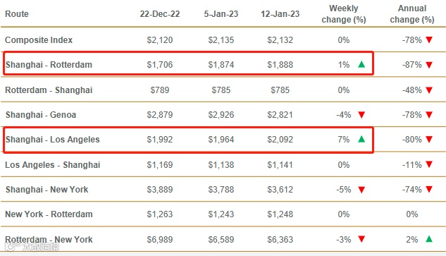 上海–鹿特丹运费上涨1%,涨6美元至每大箱1888美元;